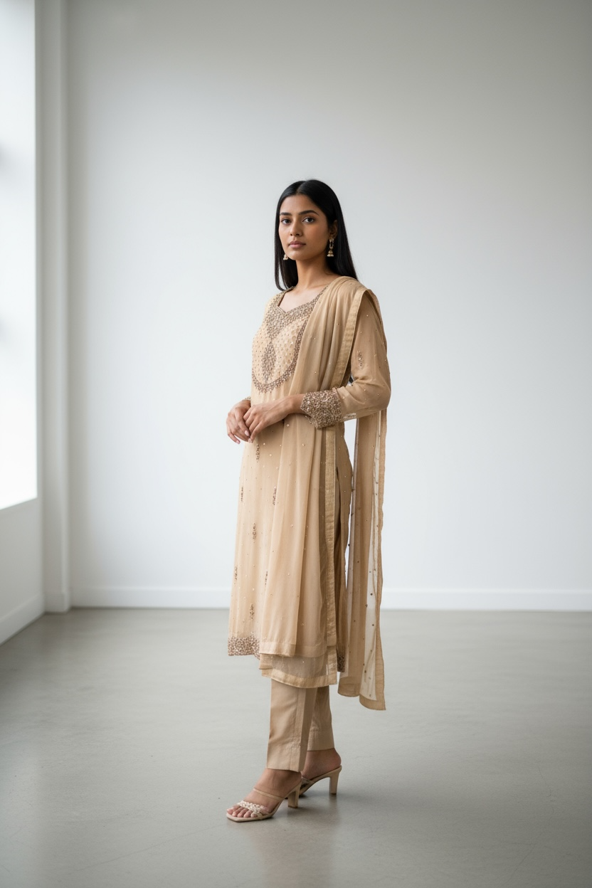 Delicate and sophisticated, this high-quality chiffon georget beige straight-cut suit exudes timeless elegance with its detailed golden embroidery. The kameez features zardozi embroidery along the neckline, cuffs, and hemline, highlighted by subtle sequin accents for a graceful shimmer. Paired with matching peach trousers for a cohesive and refined look, the outfit is beautifully complemented by a soft peach dupatta with an embroidered golden border. Perfect for festive gatherings, formal occasions, or evening events, this ensemble radiates warmth, charm, and understated glamour.