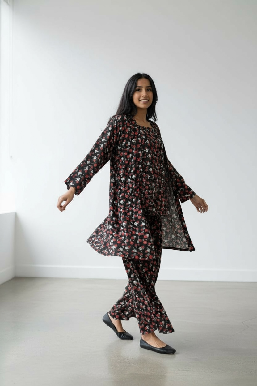 Color & Pattern: The ensemble has a black base color with an all-over, repeating floral pattern featuring red and subtle white/green rosebuds and leaves.