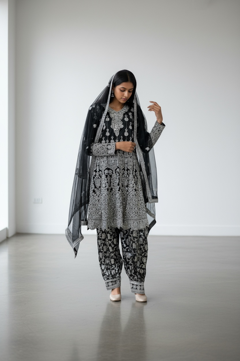 This striking black Punjabi/Afghani suit dazzles with intricate silver embroidery that creates a perfect balance of tradition and elegance. The short kameez is richly adorned with detailed motifs, adding a regal charm to the outfit. It is paired with matching brocsde shalwar pants that enhance the ensemble’s cohesive and graceful look. The sheer black dupatta, accentuated with silver embroidered borders, completes the attire. Ideal for festive occasions, weddings, or evening gatherings, this outfit exudes sophistication and timeless beauty.