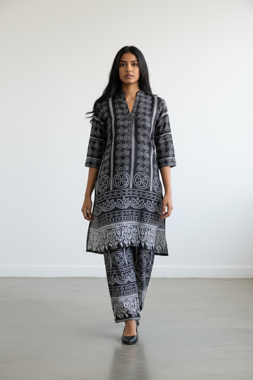 Black of 2 colours. Color & Pattern: The ensemble is a black and white base featuring an intricate, all-over geometric and traditional block-print design. This includes vertical striped panels and elaborate border motifs, typical of Pakistani and Indian textiles.