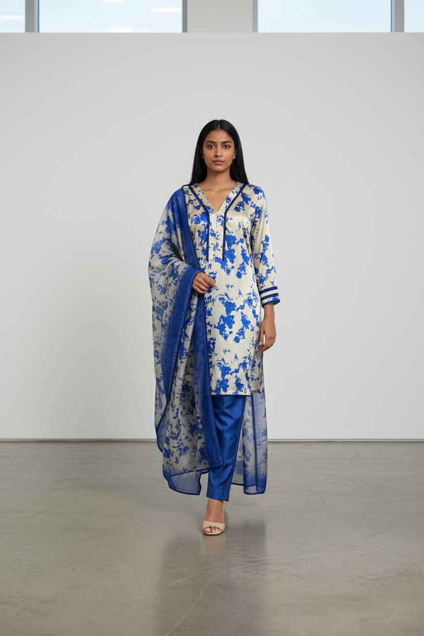 Color & Pattern: The tunic (kameez) has an off-white base color and features a vibrant, all-over floral print in various shades. The accompanying dupatta (long scarf) has a matching print with a solid royal blue border.