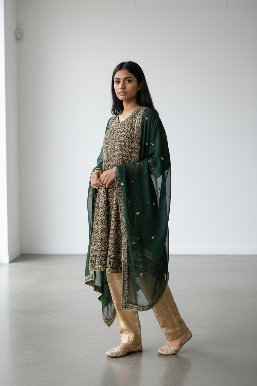 Luxurious and elegant, this deep green suit showcases timeless sophistication. The kameez is adorned with intricate gold embroidery in delicate patterns, adding a rich and regal charm to the outfit. It is paired with golden banarsi pants that enhance the ensemble’s opulent appeal. The sheer green dupatta, detailed with subtle embroidery and a gold-edged border, provides a graceful finishing touch. Perfect for winter weddings, festive occasions, or formal gatherings, this outfit exudes royal elegance and classic style.