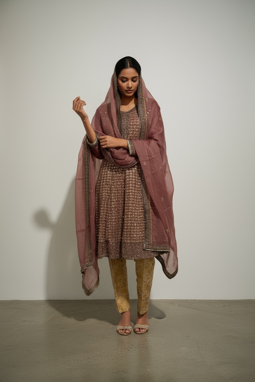 This elegant dusty rose salwar suit beautifully balances subtlety and charm. The knee-length kameez features delicate golden embroidery throughout, complemented by plain rose sleeves and a refined neckline design. It is paired with contrasting gold embroidered trousers that add a graceful shimmer to the outfit. The matching dupatta, finished with a detailed embroidered border, ties the ensemble together with sophistication. Perfect for semi-formal events, festive gatherings, or cultural celebrations, this outfit exudes warmth, elegance, and effortless style.