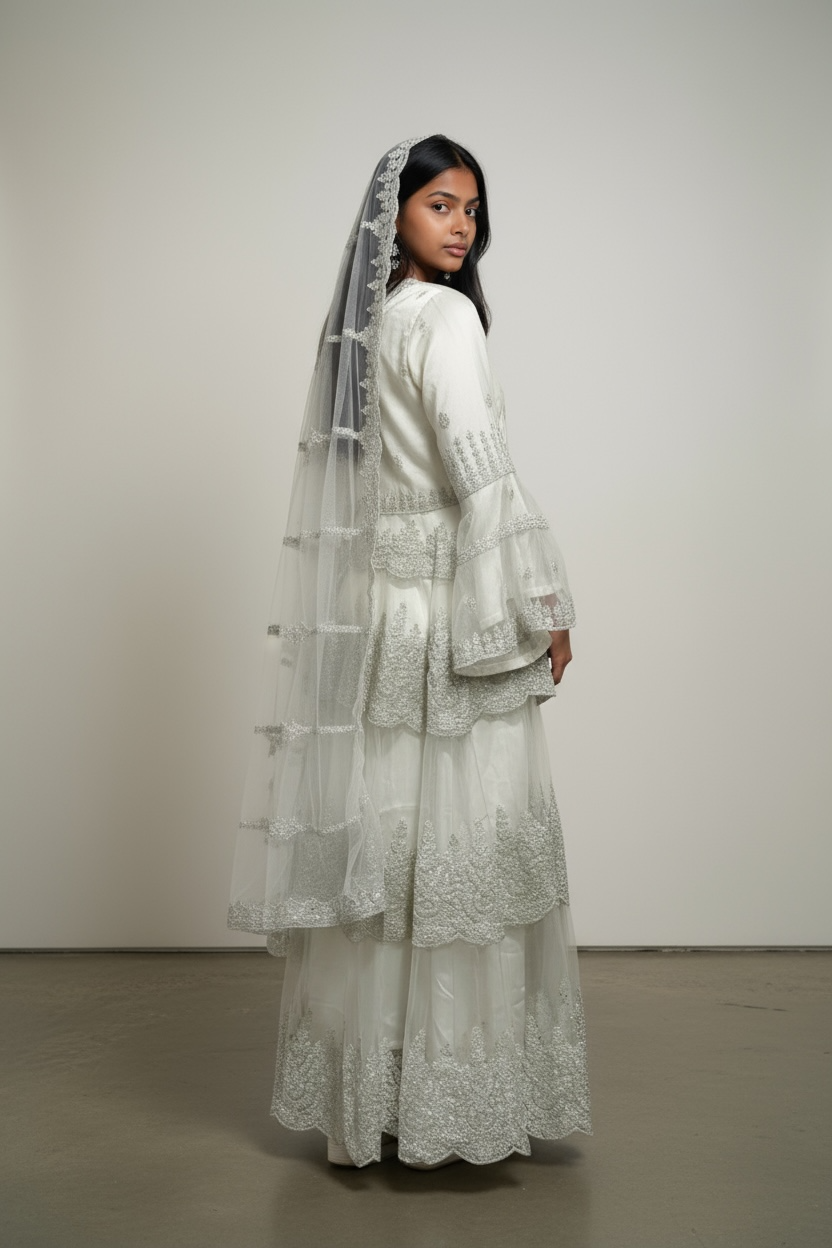 Radiating ethereal beauty, this white Anarkali suit is adorned with exquisite silver embroidery that exudes sophistication and grace. The floor-length design features delicate, detailed patterns across the bodice and hem, creating a refined and romantic look. A sheer dupatta with coordinated silver embroidery and scalloped borders adds a graceful finishing touch. Perfect for weddings, festive events, or formal celebrations, this ensemble embodies purity, elegance, and timeless charm.