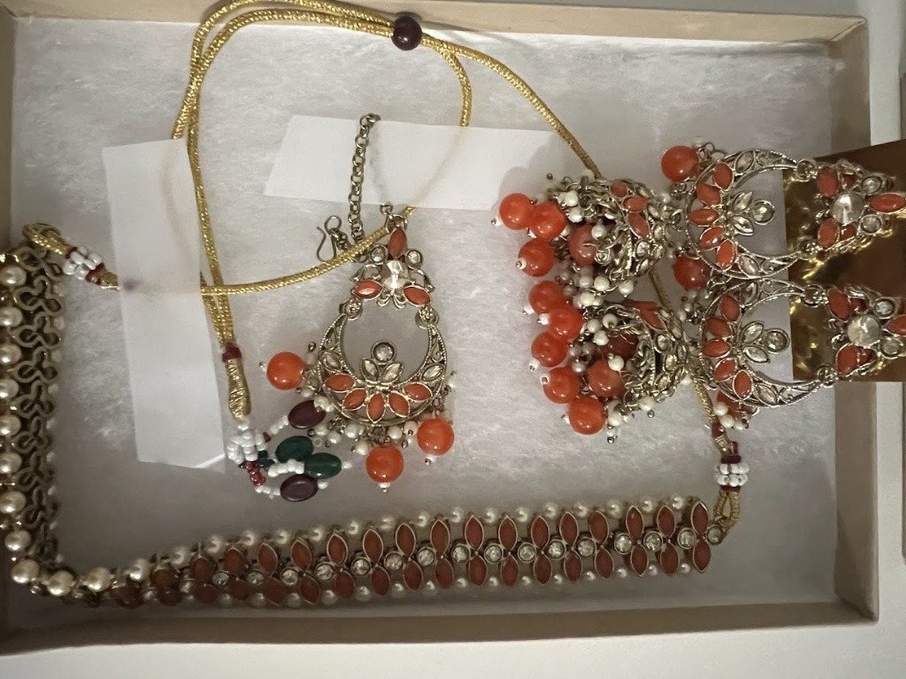 Set Components: Choker-style necklace, large Jhumka earrings, and Maang Tikka.