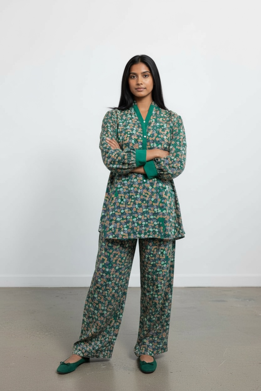 Color & Pattern: The ensemble has a green base color with an all-over, repeating floral pattern featuring red and subtle white/green rosebuds and leaves.