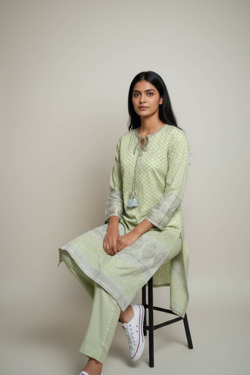Color & Fabric: The outfit is a light, pastel green made from a soft, breathable cotton-silk fabric.