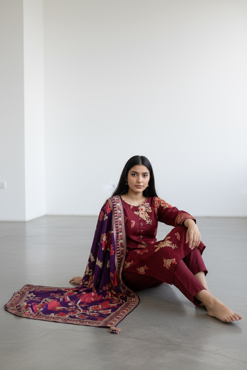 Vibrant and chic, this maroon straight-cut suit beautifully fuses rich colour with elegant floral design. The maroon kameez features subtle golden embroidery and delicate floral patterns, paired with matching maroon trousers for a refined silhouette. The highlight of the ensemble is the striking purple dupatta, adorned with large, bold red and beige floral prints and an intricate patterned border, adding a captivating contrast. Perfect for festive occasions, casual gatherings, or day events, this outfit exudes confidence, elegance, and modern ethnic charm.
