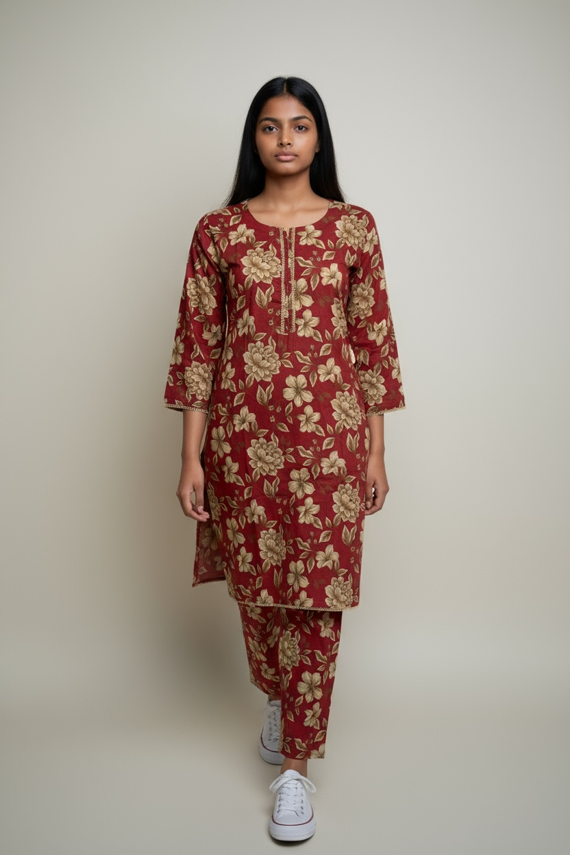 Design: The outfit consists of a long, straight-cut tunic (kurta or kameez) with three-quarter sleeves and a round neckline with a V-slit opening, and matching straight-leg trousers. The neckline and sleeve hems feature subtle decorative trim or “dory work”.