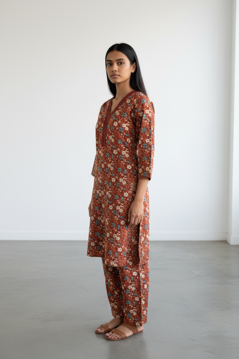 Color: The outfit is a rich, earthy maroon color with an all-over intricate floral print in subtle coordinating tones.
