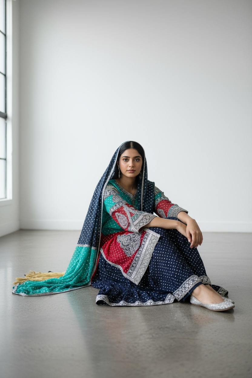Vivid and eye-catching, this multicolour sharara set beautifully blends tradition with playful elegance. The outfit features a teal, red, and navy blue slim gown adorned with intricate silver embroidery and mirrorwork-inspired detailing, adding a festive sparkle. A coordinated multitone dupatta with subtle embellishments completes the vibrant ensemble. Perfect for festive occasions, weddings, or cultural celebrations, this outfit radiates joyful energy and unique style.