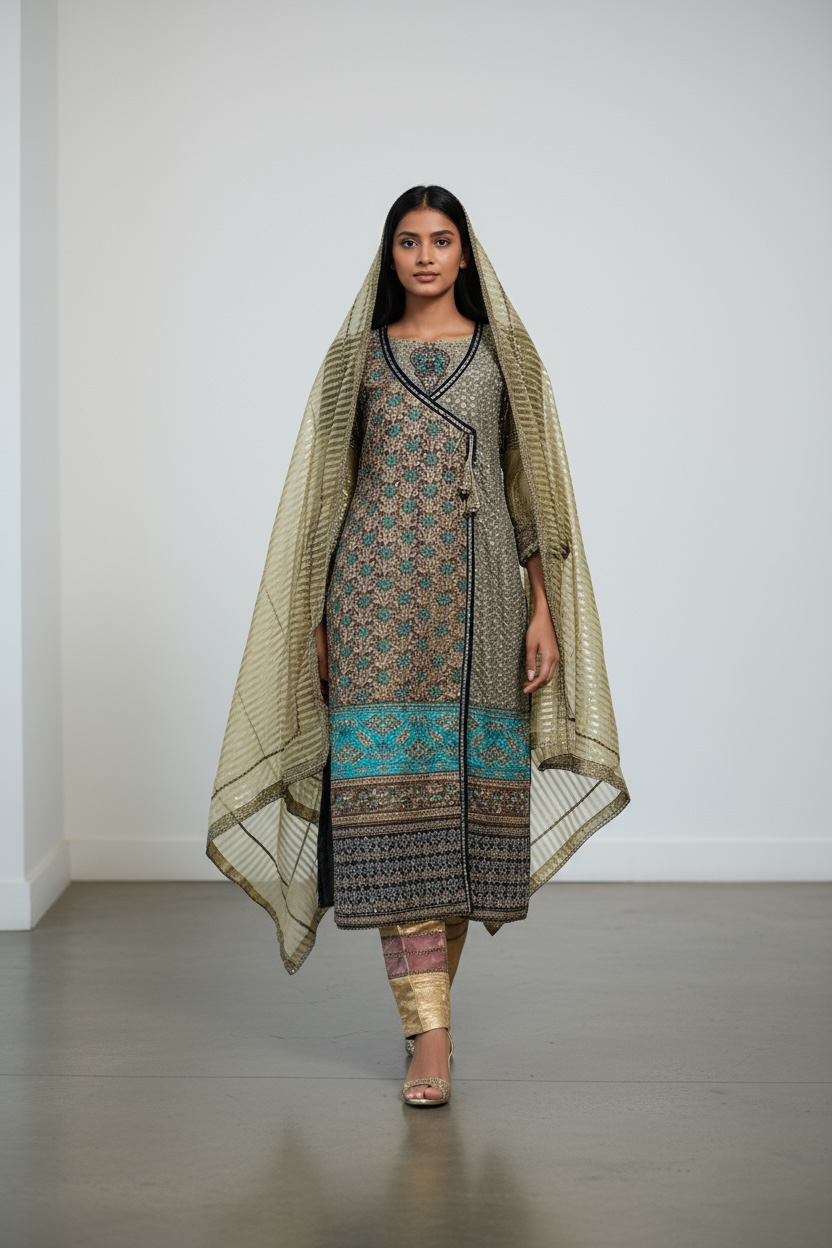 Rich in culture and colour, this multicolour anarkali style suit is a beautiful fusion of traditional patterns and contemporary flair. The kameez features intricate prints and embroidery in earthy tones accented with turquoise highlights, creating a vibrant yet elegant look. Paired with striped multicolour trousers that add a unique artistic touch, the ensemble stands out with authenticity and charm. The golden dupatta with fine striped detailing completes the outfit gracefully. Perfect for festive events, cultural gatherings, or casual celebrations, this suit radiates heritage-inspired elegance and joyful vibrancy.