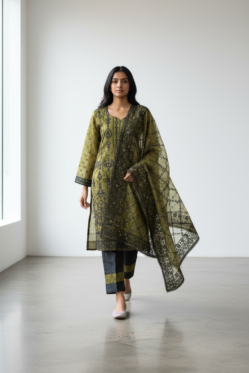 Vibrant and elegant, this mustard yellow straight-cut suit stands out with its striking black embroidery. The kameez features intricate embroidered patterns along the neckline, sleeves, and hemline, blending traditional artistry with a bold, modern contrast. Paired with sleek black trousers accented with matching embroidered borders, the ensemble is completed by a sheer mustard dupatta adorned with detailed black embroidery. Perfect for festive occasions, cultural gatherings, or evening events, this outfit radiates confidence, tradition, and timeless appeal.