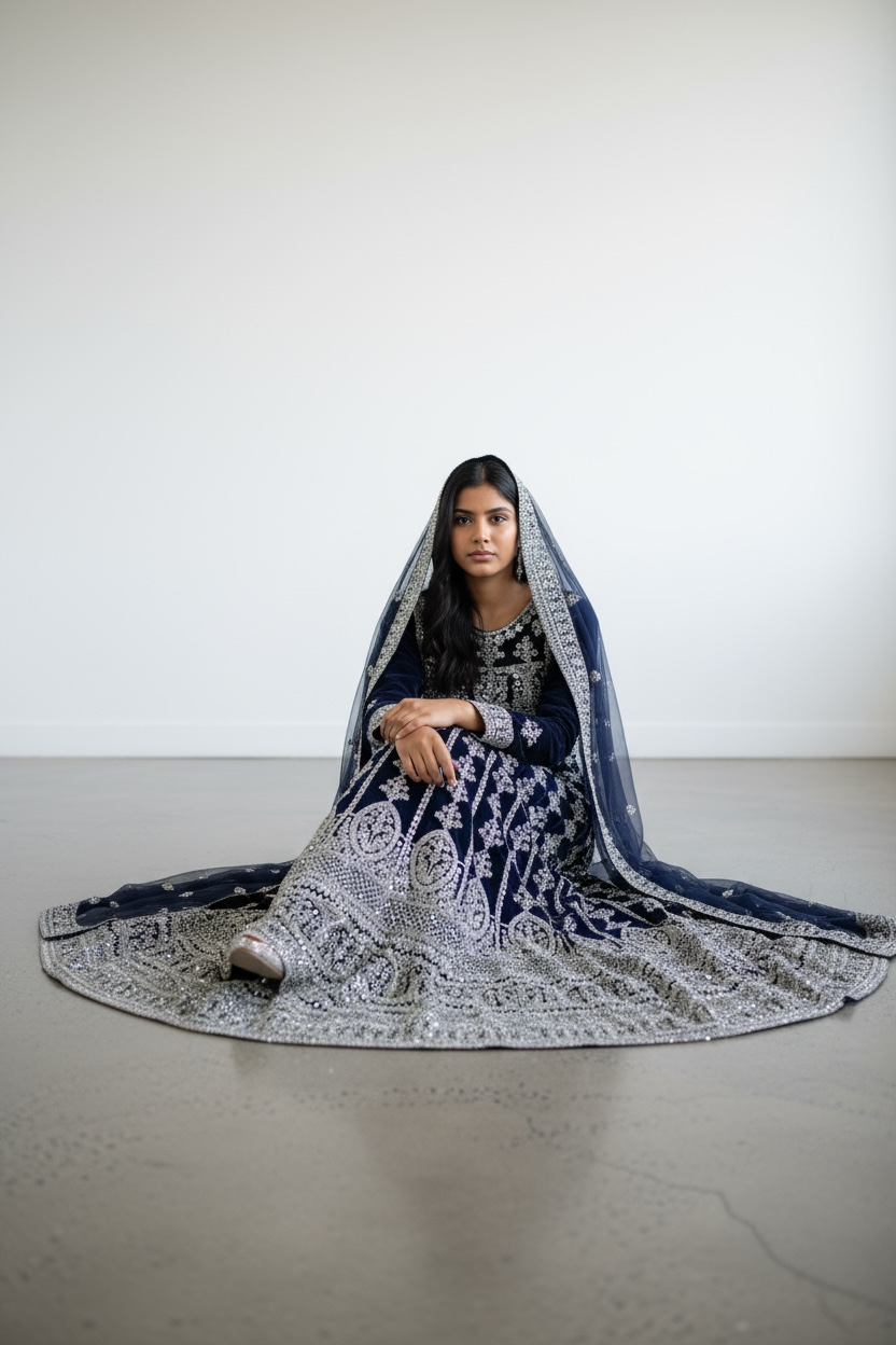 Stunning high quality net with sheesha, crystal and dori-work, best for any wedding function . Includes, silk full sleeves long inner, trousers, and net dupatta with heavy borders.
