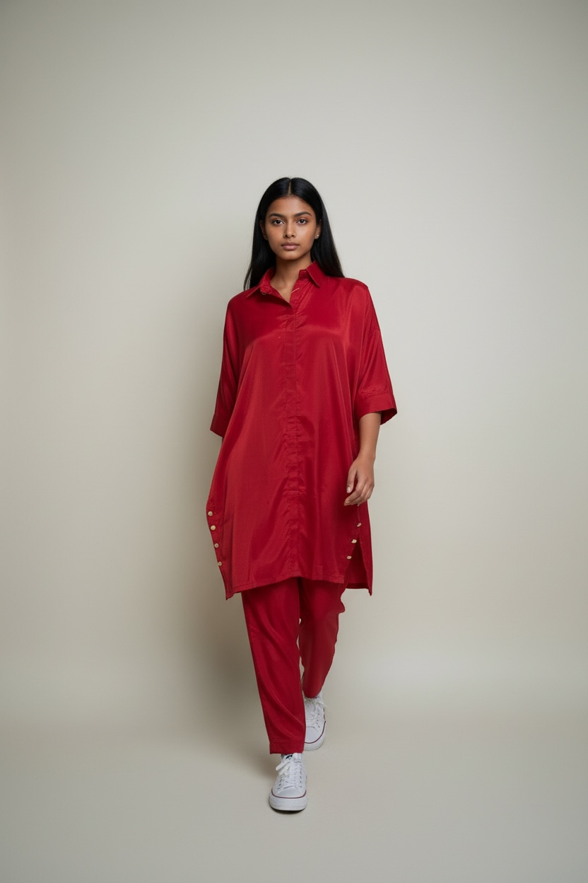 Color: A solid, rich red hue throughout the entire outfit.