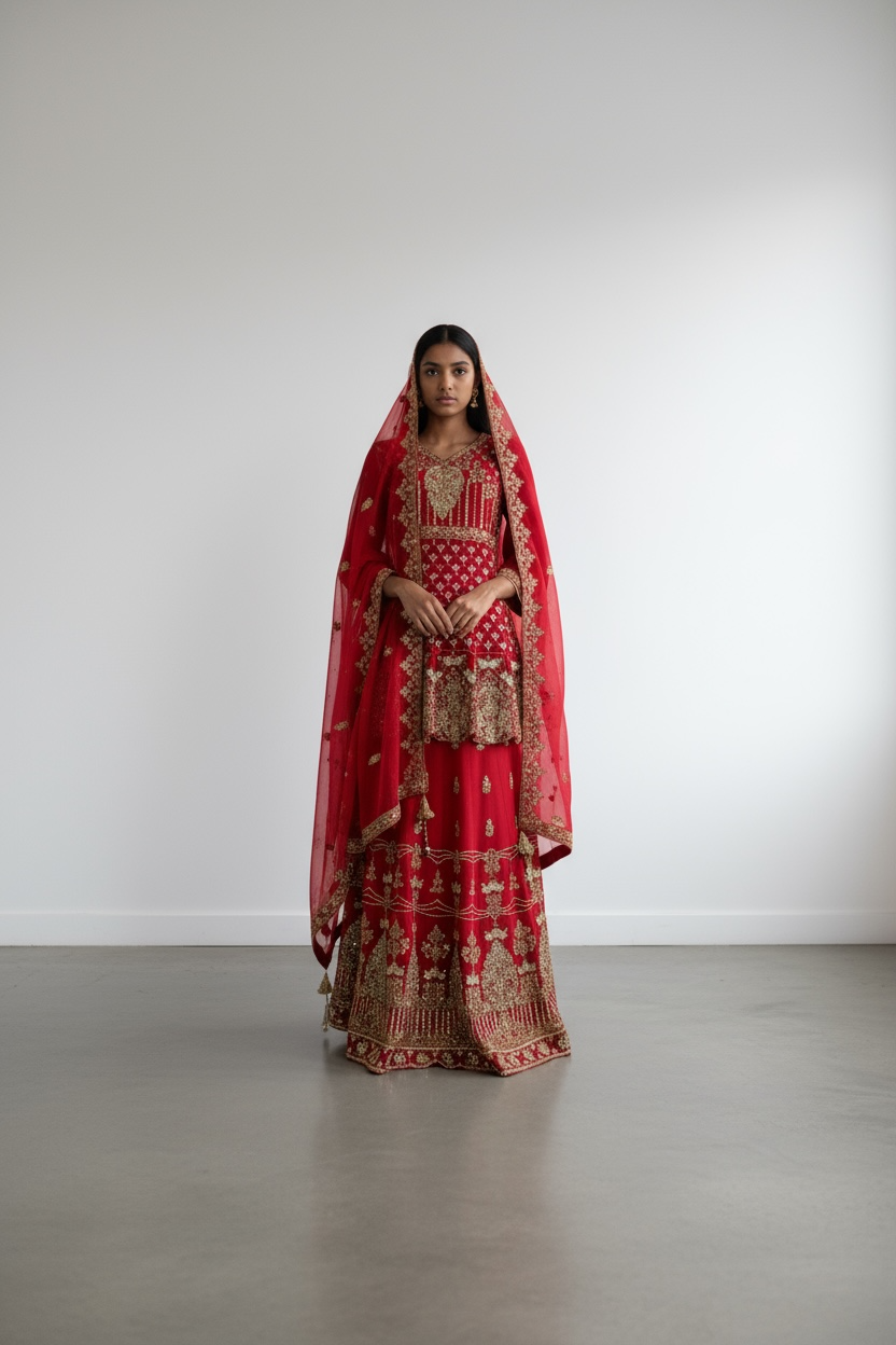 Vibrant red coloured high quality chiffon lehenga and frock-style peplum with heavy sheesha, crystal and dori-work, best for any bridal and wedding function . Includes, Lined full sleeves chiffon mid-length frock and sharara heavy chiffon dupatta.