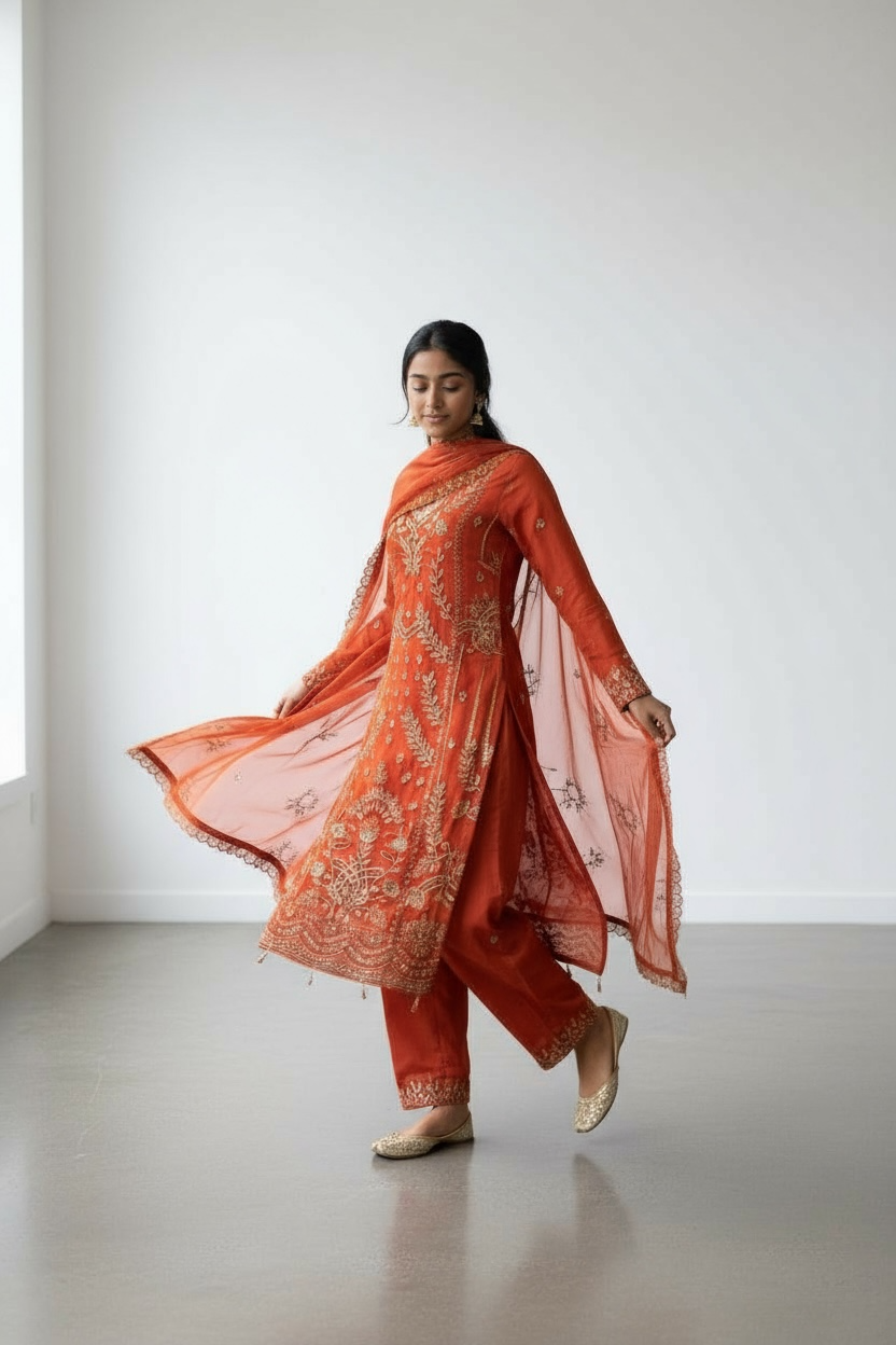 Vibrant and regal, this rust orange straight-cut suit captures traditional richness with its intricate golden embroidery. The kameez features detailed floral and paisley motifs along the front and hemline, creating a luxurious and festive look. Paired with matching rust trousers for a coordinated appearance, the ensemble is complemented by a sheer dupatta adorned with matching embroidery and delicate borders. Perfect for weddings, festive celebrations, or cultural events, this outfit radiates warmth, elegance, and refined traditional beauty.