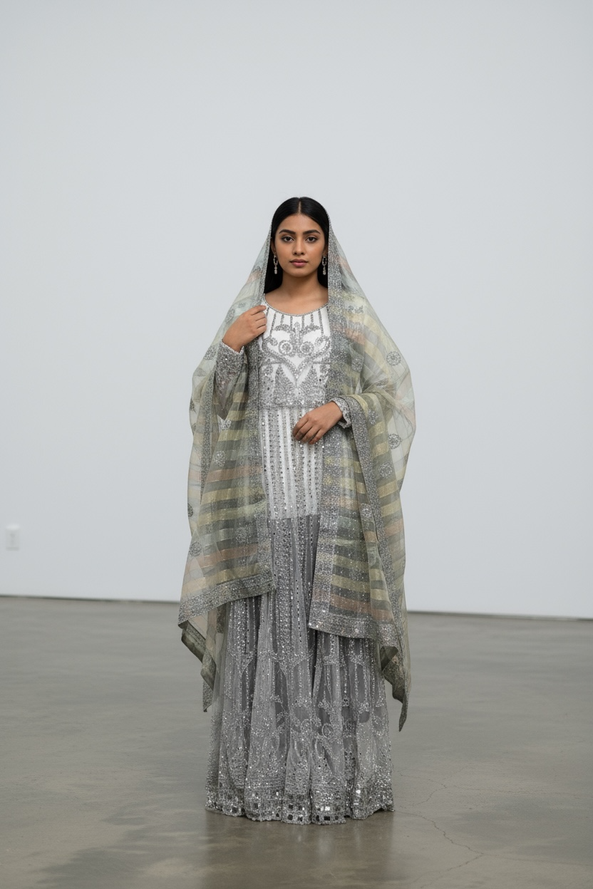 Elegant and contemporary, this silver grey Maxi suit exudes refined beauty with its detailed embroidery and graceful silhouette. The Anarkali style features intricate silver threadwork and geometric patterns that add texture and sophistication. Paired with a soft, multicoloured striped dupatta, it introduces a modern twist to the traditional ensemble. Perfect for festive celebrations, receptions, or formal gatherings, this outfit blends subtle shimmer with timeless charm, making it a standout choice for any elegant occasion.