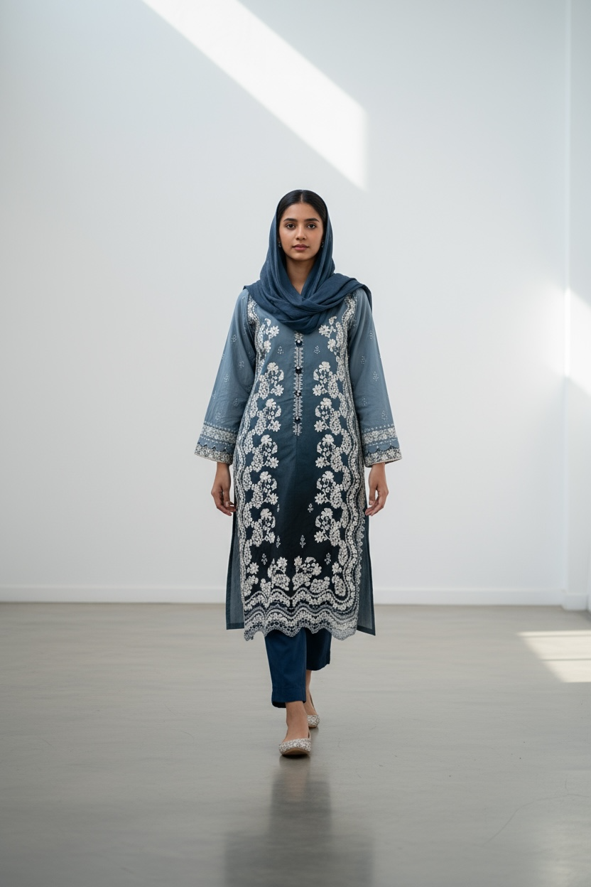 Includes two tone cotton shirt, undershirt, black cotton trousers and slate blue dupatta. Stylish and refined, this slate blue and black ombre straight-cut suit exudes modern elegance with its beautifully blended tones and intricate embroidery. The kameez features delicate white floral embroidery that enhances the gradient effect, creating a graceful and artistic look. It is paired with black trousers for a sleek and balanced finish. A matching blue dupatta complements the outfit, adding a touch of sophistication. Perfect for semi-formal gatherings, festive occasions, or evening outings, this ensemble radiates contemporary charm with traditional finesse.