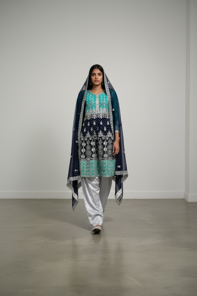 Vibrant and stylish, this teal and navy blue Punjabi suit offers a perfect blend of tradition and modern flair. The kameez features intricate silver embroidery in elegant floral and geometric patterns, creating a striking contrast between the teal upper section and navy blue lower half. Paired with light gray trousers and a matching navy blue dupatta, the ensemble balances bold colour with intricate detailing. Ideal for festive occasions, cultural events, or semi-formal gatherings, this outfit radiates freshness, elegance, and charm.
