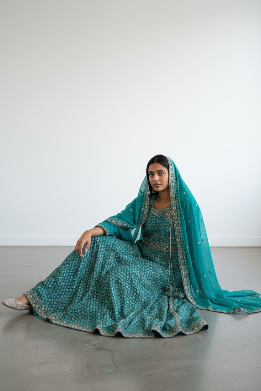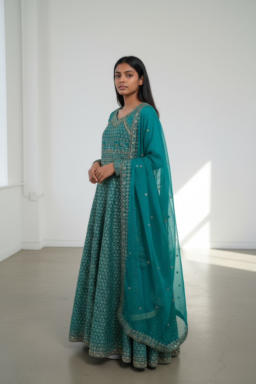 This stunning teal blue Anarkali suit radiates elegance with its intricate gold embroidery and regal silhouette. The floor-length Anarkali features delicate all-over golden threadwork, accentuating the bodice and hemline for a refined, graceful look. A matching teal dupatta with gold edging adds an extra layer of sophistication, completing the ensemble beautifully. Perfect for weddings, festive celebrations, or formal occasions, this outfit embodies timeless tradition with a touch of modern glamour.