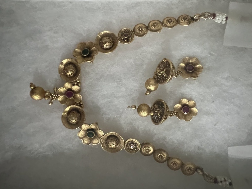 Subtle Components: The set includes an adjustable Collar/Choker Necklace and a pair of matching Dangle Earrings featuring floral studs and gold-beaded drops. It’s a comfortable, mid-size set for longer events.