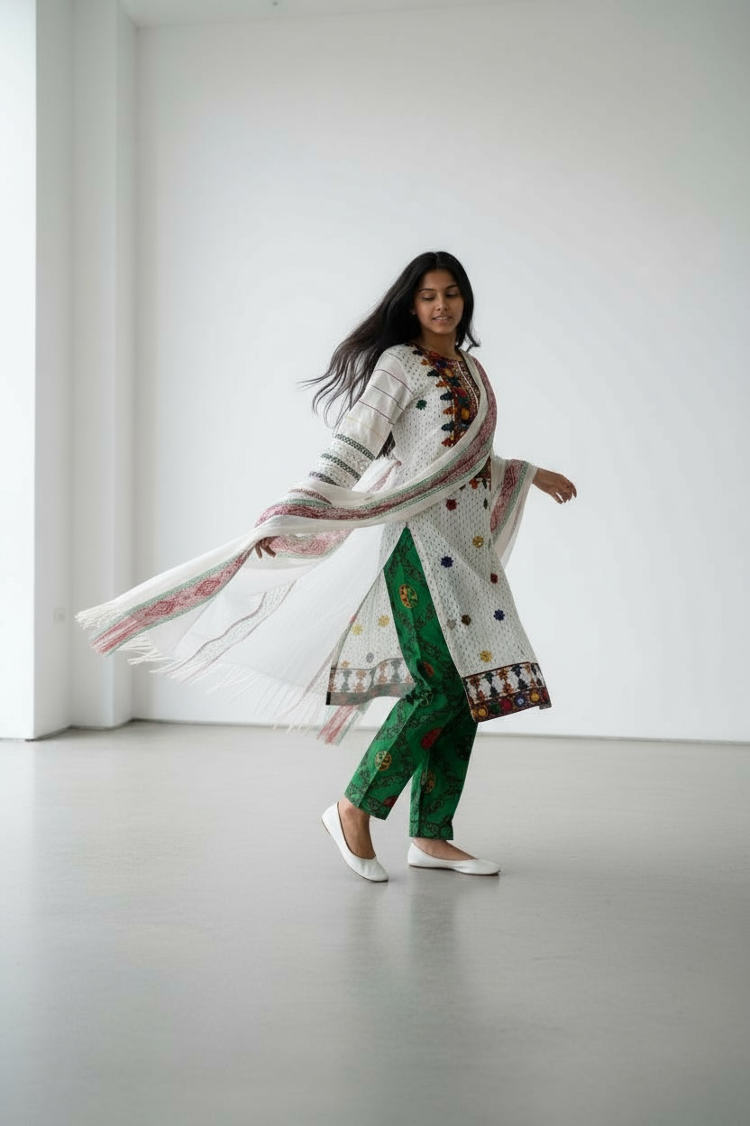 Bright and festive, this white straight-cut suit celebrates traditional artistry with vibrant Sindhi embroidery. The kameez features colorful geometric and floral patterns along the neckline and border, paired with delicate mirror accents for a touch of sparkle. The green trousers with bold rose prints add a playful contrast, while the white dupatta with multicolour threadwork and tassel edging completes the lively ensemble. Perfect for festive occasions, cultural events, or casual celebrations, this outfit radiates cheer, tradition, and joyful charm.